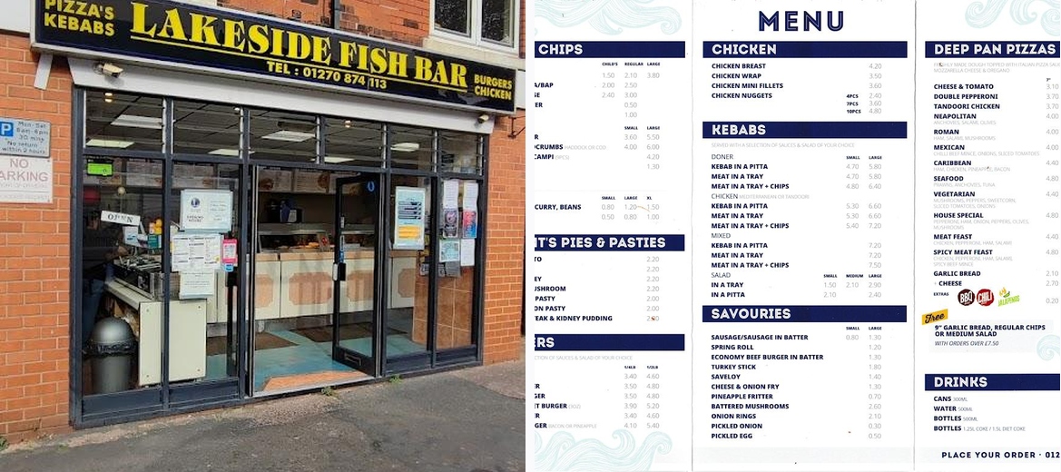 Additional options like pizza and kebabs diversify the menu, drawing in a wider crowd. Unique offerings such as chips in a pitta or bap elevate the traditional chip shop experience, catering to adventurous eaters. Lakeside's affordability, with most meals under £10, also gives it an edge, making it accessible for both students and families.